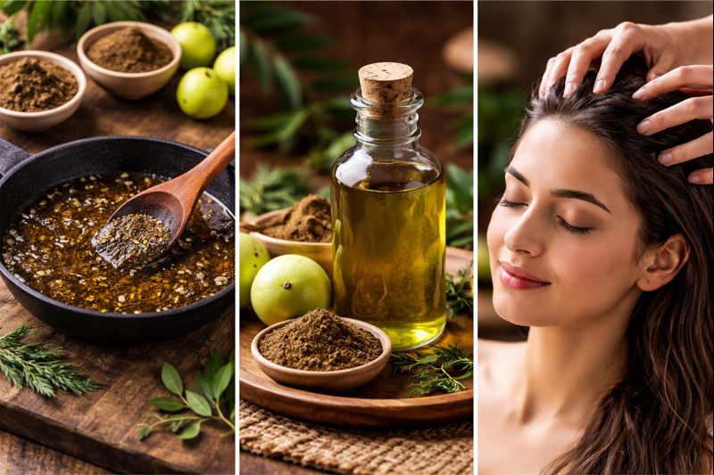 Learn how to prepare and use an Ayurvedic herbal hair growth oil using amla and bhringraj to reduce hair fall and promote natural hair growth.
